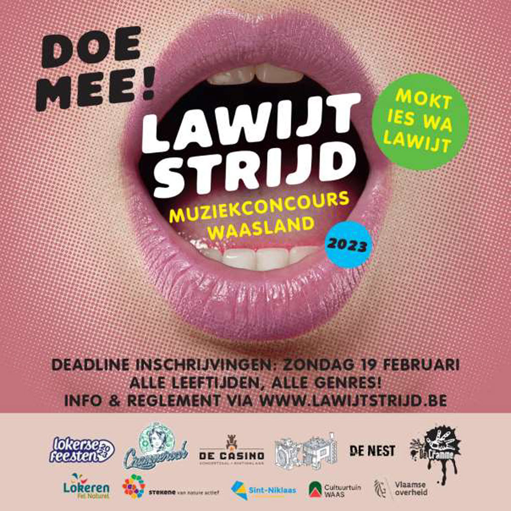 De Lawijtstrijd 2023 is een samenwerkingsverband van De Casino Concertzaal, Lokerse Feesten, Crammerock en jeugdhuizen Den Eglantier (De Nest), De Cramme en Okapi. De wedstrijd wordt ondersteund door Cultuurtuin Waas (Interwaas) en de stads- en gemeentebesturen van Lokeren, Sint- Niklaas en Stekene. (mb)