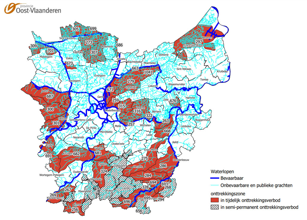 OOST-VLAANDEREN. Oost-Vlaams gouverneur Carina Van Cauter heeft het bestaande semi-permanent onttrekkingsverbod uitgebreid. Daardoor mag er vanaf morgen, 7 juli 2023, geen water getrokken uit 42 onttrekkingszones van de onbevaarbare waterlopen en publieke grachten in Oost-Vlaanderen.