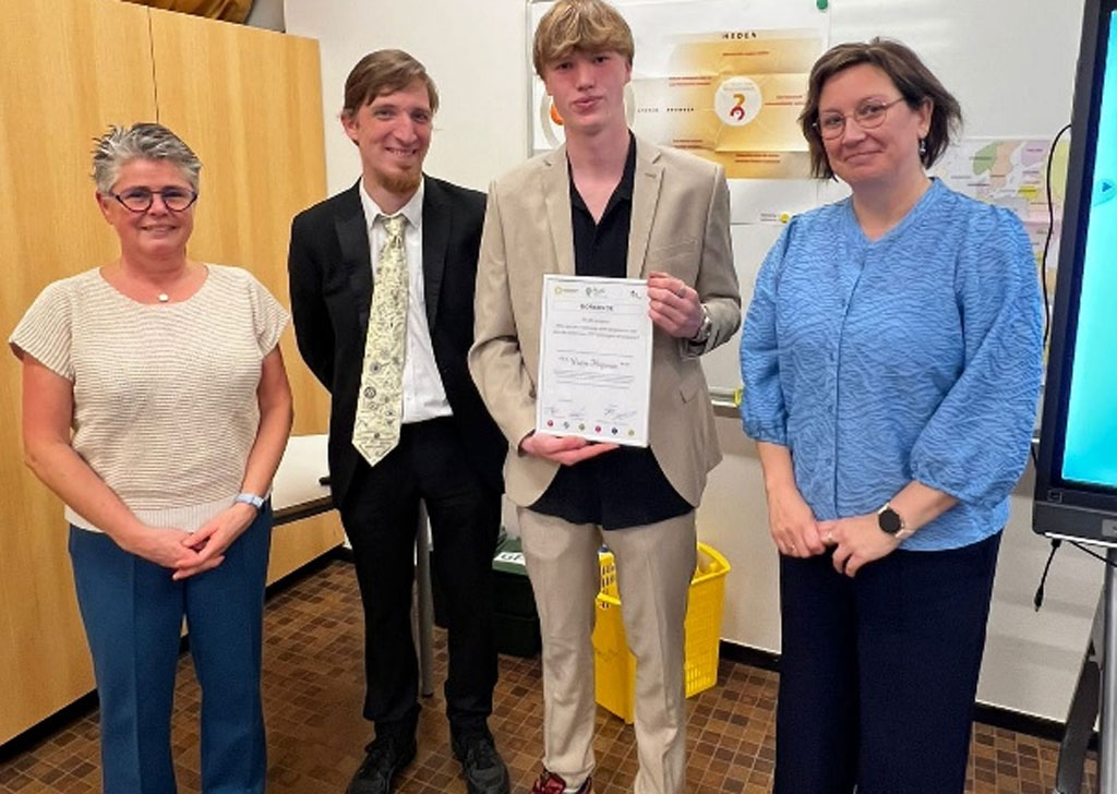Het FLUO-project is het resultaat van jarenlange inzet. De coaches bedanken in het bijzonder Lieve De Pesseroey voor haar visionaire impuls, en erkennen ook de steun van de directieleden Elke De Ridder en Jeffrey De Block, die mee hun schouders onder het project zetten. (mb, foto: Zesdejaars Wietse presenteerde vorige week zijn onderzoek. © Berkenboom Humaniora)