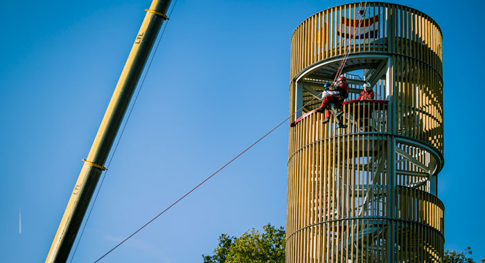 STEKENE. Zaterdag is in het Waterwingebied nabij ’t Vossenhol in Stekene het lang verwachte uitzichtpunt Niemandsland geopend. De 22 meter hoge Spaanse toren staat vlakbij grenspaal 281 langs wat ooit een beruchte smokkelroute was. Verspreid over vijf verdiepingen krijgen bezoekers informatie over de natuur, het agrarisch karakter en de geschiedenis van de omgeving. Zo’n 500 nieuwsgierigen woonden de opening bij. De aanwezigen konden op een streekmarkt genieten van streekproducten.