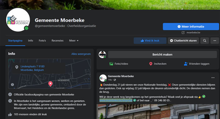 MOERBEKE. De gemeente Moerbeke heeft haar officiële facebookpagina ‘Gemeente Moerbeke’ gelanceerd. De gemeente wil de pagina gebruiken om haar inwoners te informeren rond wegenwerken, dienstverlening, burgerparticipatie en ander gemeentelijk nieuws zoals het lopende fusieonderzoek met Lokeren.  Ook de gemeentelijke website moerbeke.be en het driemaandelijkse infomagazine blijven officiële informatiekanalen.