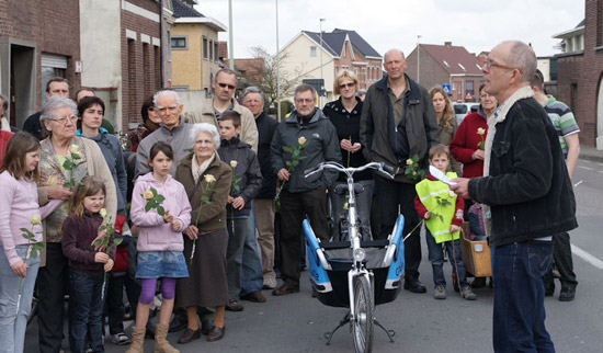 Elke deelnemer kreeg een roos om zo een hulde te brengen. Voorop de echtgenoot van de verongelukte dame Jenny Vermeiren.