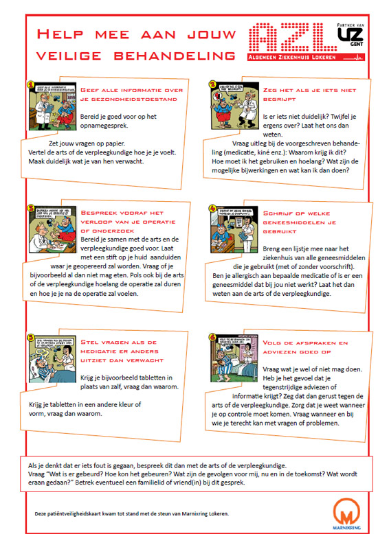 LOKEREN. De veiligheid van de patiënt is belangrijk in het AZ Lokeren. Omdat patiëten hierin zelf ook een aandeel hebben, werkt het Lokerse ziekenhuis al enkele jaren met een 'patiëntveiligheidskaart'. Die kaart is door Urbanustekenaar Willy Linthout in stripvorm gegoten. Deze urbanus-patiëntenveiligheidskaart heeft op het symposium in de Bozar in Brussel de publieksprijs gewonnen. Het symposium is in gericht door de FOD Volksgezondheid en gaat over patiëntveiligheid.
