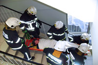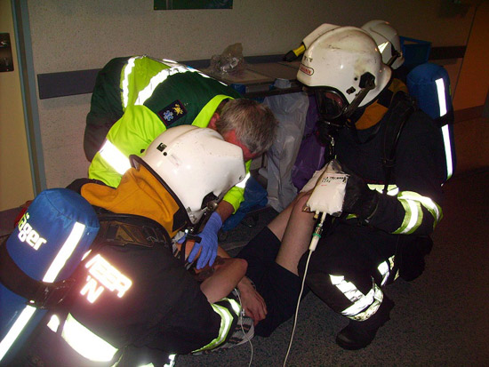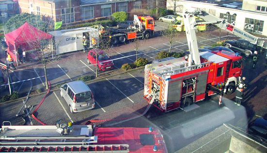 LOKEREN. Voorbije zaterdagnamiddag 10 december werden in de omgeving van het Lokerse ziekenhuis een aantal straten door de politie afgesloten. Enkel personen die er wonen of werken werden toegelaten. Reden was een grootscheepse noodplanoefening, volgens een scenario waarbij brand uitgebroken was op de 2° verdieping van de kliniek, en waarbij 16 patiënten geëvacueerd moesten worden. Vanzelfsprekend waren buurtbewoners en patiënten vooraf geïnformeerd dat het om een oefening ging.