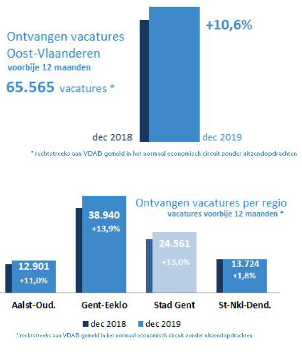 Het aantal ontvangen vacatures bij VDAB in Oost-Vlaanderen in 2019 blijft stijgen en dat met 10,6% tegenover 2018. In de laatste 12 maanden werden in Oost-Vlaanderen 65.565 NEC-vacatures rechtstreeks bij VDAB gemeld. Daarbij zijn de de vacatures van werving- en selectiekantoren en uitzendopdrachten door uitzendkantoren niet meegeteld. (mb)