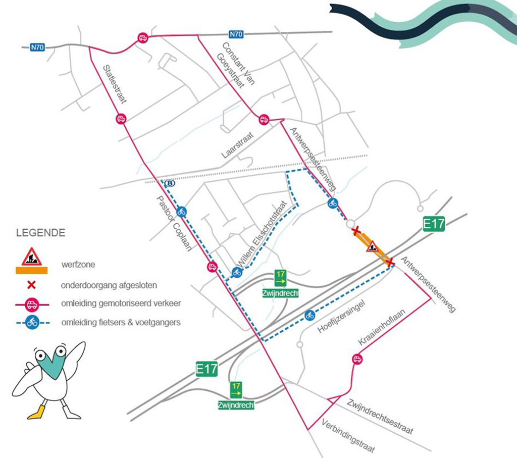 Het verkeer moet omrijden via de Kraaienhoflaan, de Pastoor Coplaan en de N70 naar de Antwerpsesteenweg. Fietsers moeten omrijden via de Willem Elsschotstraat. Na het weekend wordt de vrije doorgang terug 4,40 meter en vervalt de omleiding voor vrachtverkeer. (mb)