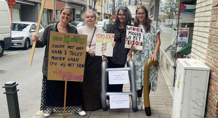 SINT-NIKLAAS. Een delegatie van de jongerengroep van PVDA Sint-Niklaas trok gisteren door de stad om te protesteren tegen de pensioenplannen van de federale regering. Ze deden dat verkleed als ‘omaatjes’.