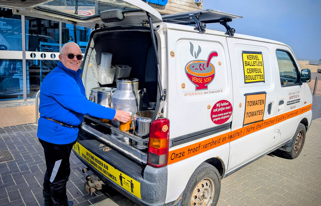 Horen we in de verte een belleman? Een ijscrémekar? Nee hoor, er bestaan nog rondrijdende soepmannen in ons landje, met de nummerplaat ‘soep’. Met veel enthousiasme houdt Johan Blanckaert op verschillende locaties halt om zijn vele trouwe klanten op hun favoriete soep te trakteren. Bij Johan draait alles om de liefde voor zijn vak met eenvoud en kwaliteit gemaakt maar boordevol smaak en vitamientjes. Geen kunstmatige toevoegingen of bewaarmiddelen maar de échte puurheid van smaken. Soep zoals die in feite bedoeld is. Neem gerust een kijkje op de website om de locaties en uren waar hij staat te vinden.