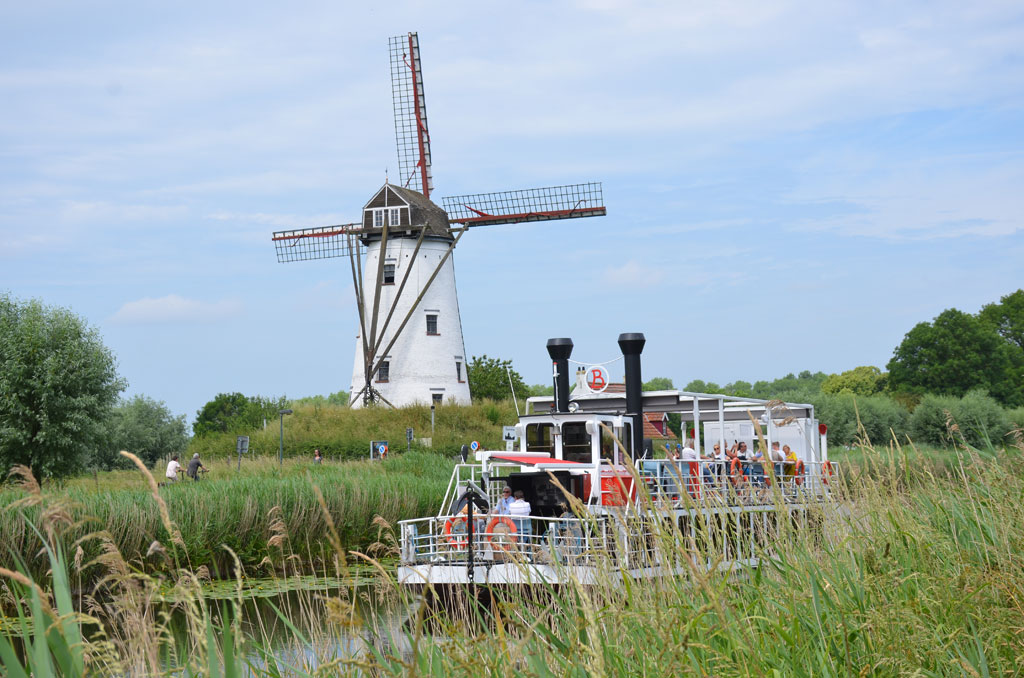In pakweg zestig jaar is er weinig veranderd in Damme. Er is nog steeds de boekenmarkt, de vaste nestplaats van de ooievaars op het stadhuis en het klokje dat steeds wat trager tikt. Ver weg zijn de therapeuten, geestverruimende paddenstoelen, Burger Kings en lange files. De inwoners drinken ’s morgens nog een tas verse melk en de zorgen van het leven worden ’s avonds doorgespoeld met een Damse gin. Qua slow motion of happiness maken we deze namiddag een tochtje met de nostalgische Lamme Goedzak. Aardig wat volk op deze populaire rivierboot die zo’n viermaal per dag heen en weer vaart tussen Damme en Brugge. De Lamme Goedzak baadt terug in zijn authentieke stijl van weleer en biedt elke bezoeker die aan boord stapt, een unieke en nostalgische ervaring langs het meest schilderachtige panorama van het Brugse Ommeland. De slome boot laat ons gedurende 2 x 35 minuten genieten van het voorbijglijdend polderlandschap omzoomd met statige populierenrijen. Zeker te noteren...
